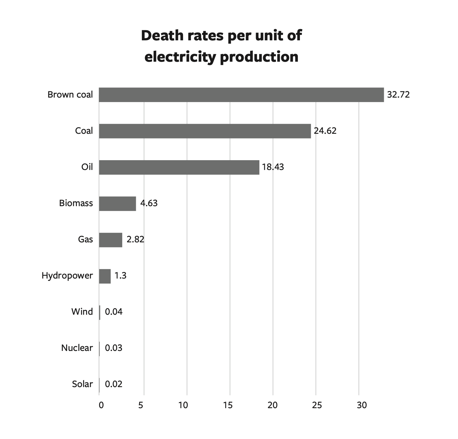 Energy solutions need to be safe. They need to minimize loss of life, negative health effects, and workplace accidents. One way of evaluating the safety of an energy source is to examine how many people die from accidents or from the air pollution that the source produces for every unit of electricity it produces. The following graph compares the safety record of various energy sources (data here).